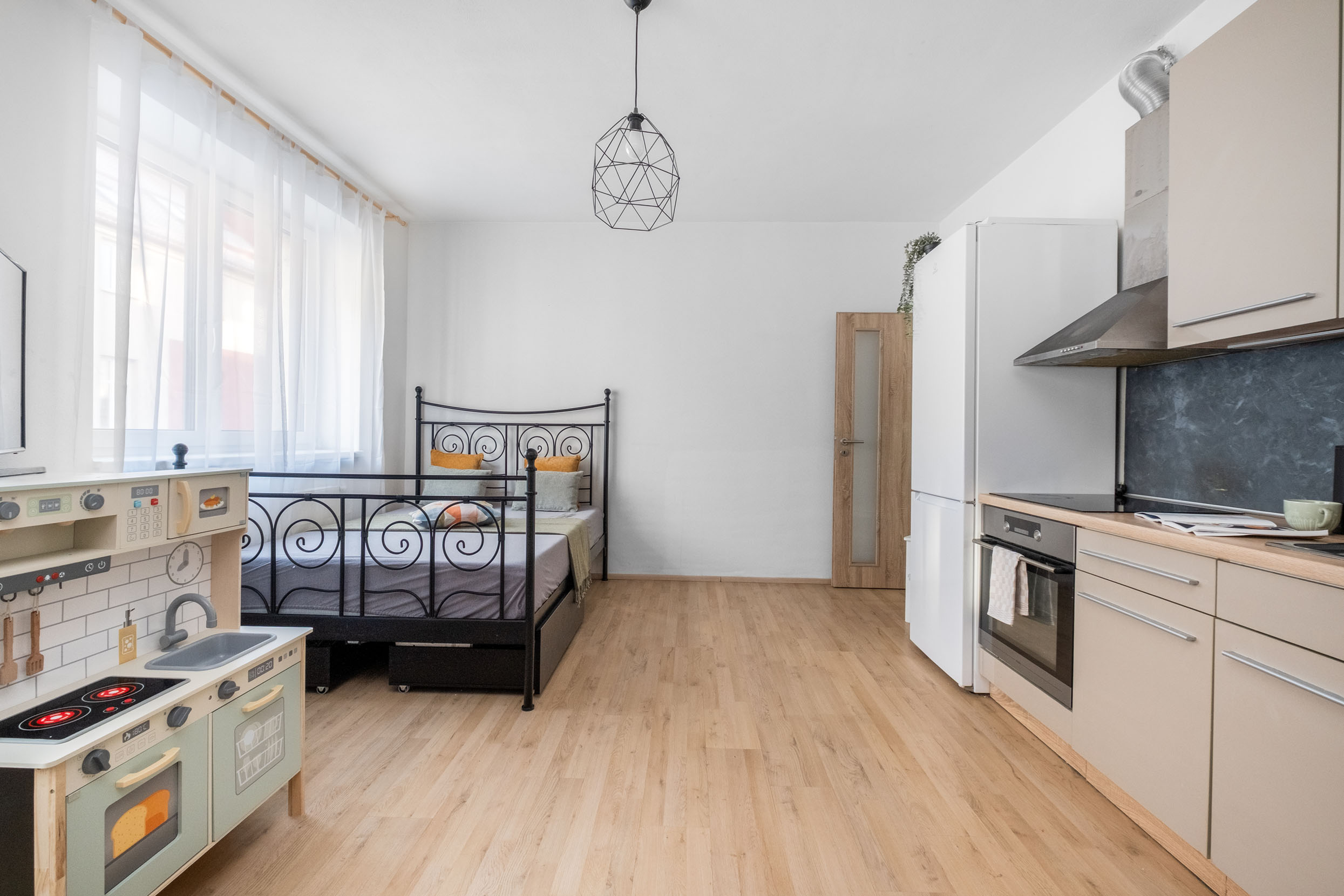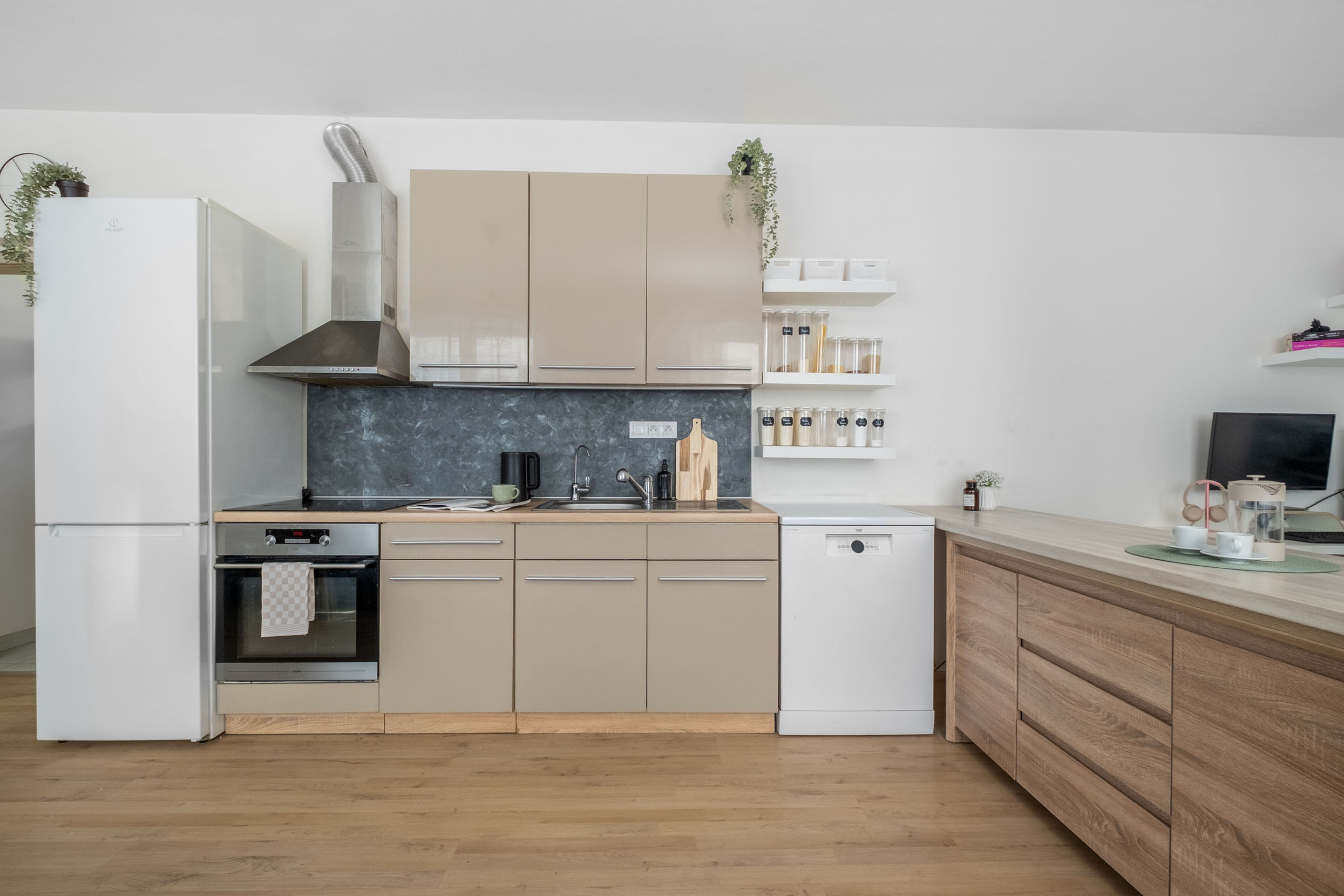 V celém bytě najdete praktickou kombinaci plovoucích podlah a dlažby pro snadnou údržbu. Samozřejmostí je vysokorychlostní optický internet. Celý dům i společné prostory jsou navíc zabezpečeny kamerovým systémem, což vám dodá maximální pocit bezpečí.