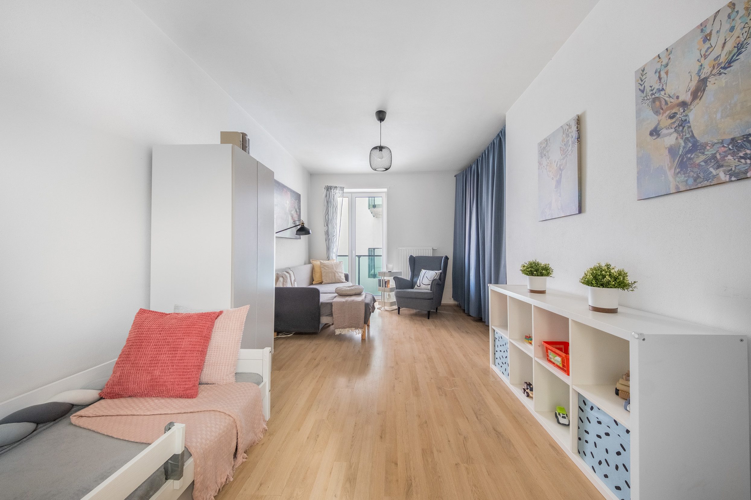 Samostatná šatna: Velká výhoda tohoto bytu! Kompletní modulární systém IKEA řeší úložné prostory elegantně a bez nutnosti zaplňovat pokoje skříněmi, případně prostor pro postel.