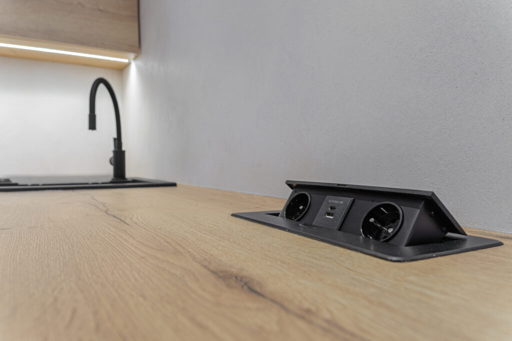Dominantou bytu je kuchyňská linka na míru s moderními prvky, LED podsvícením a nočním osvětlením na čidlo, doplněná o kvalitní spotřebiče značky Gorenje.