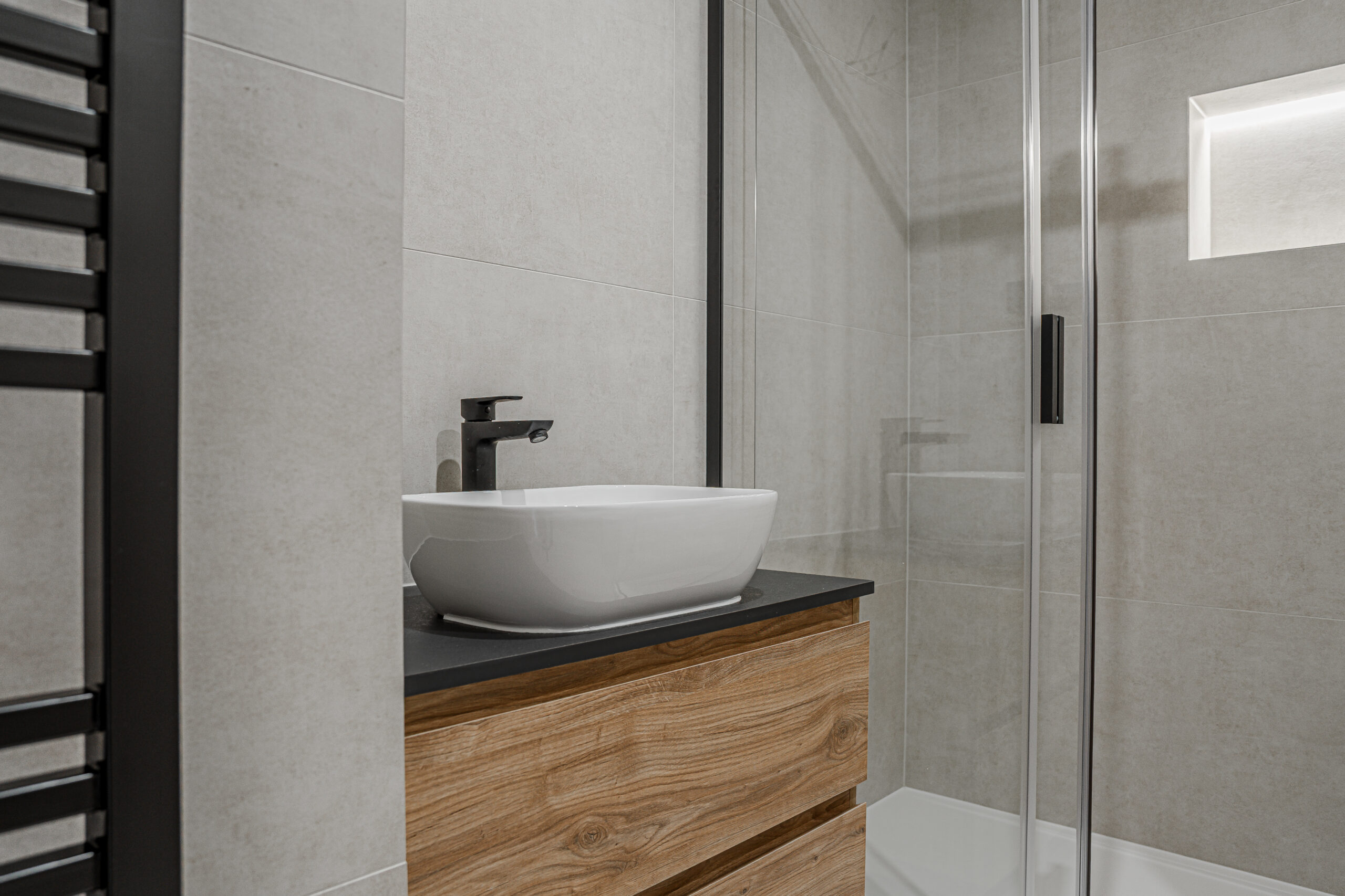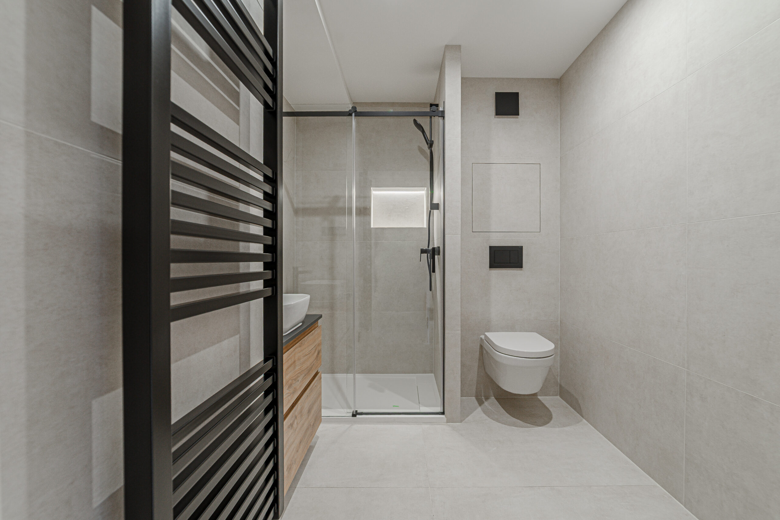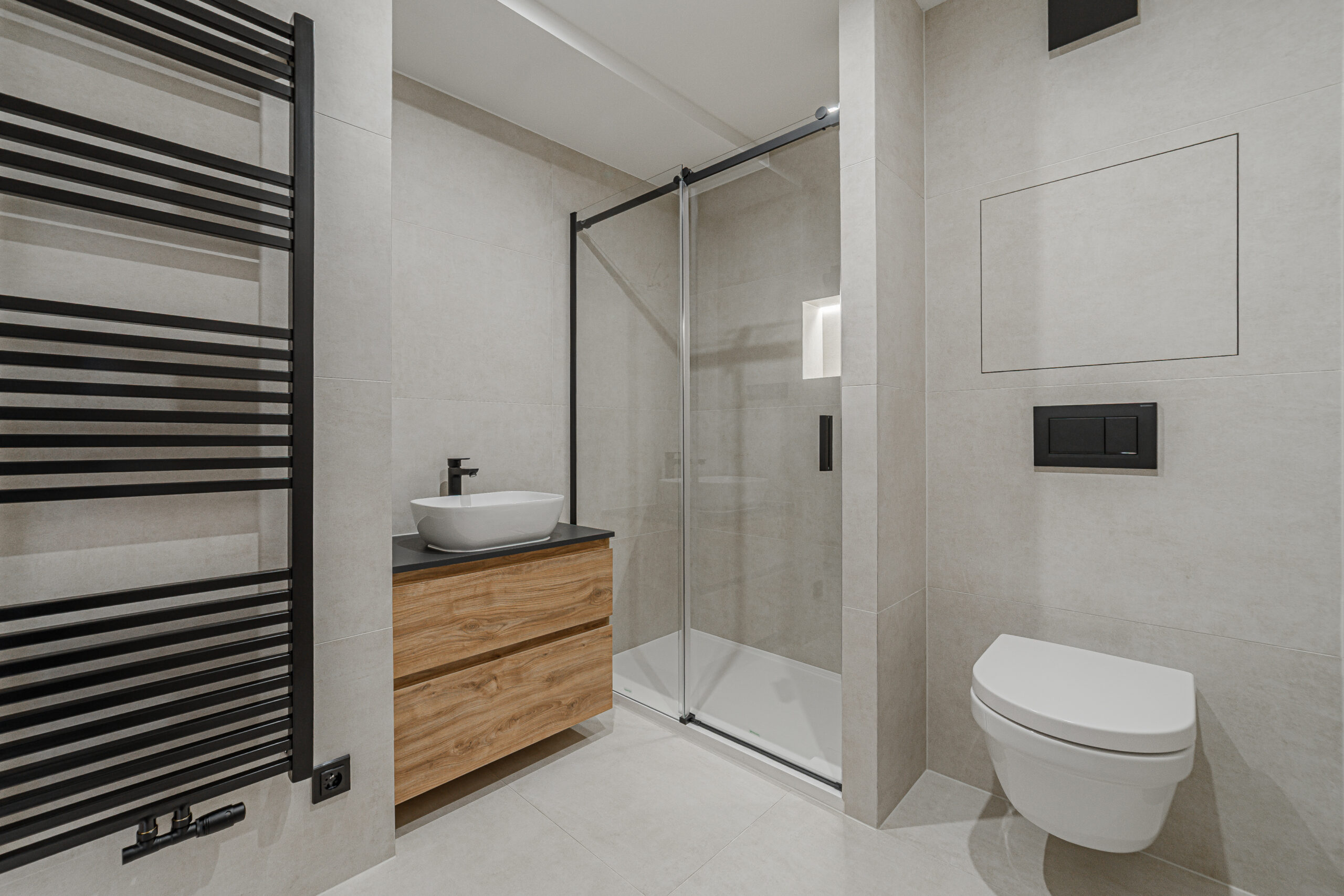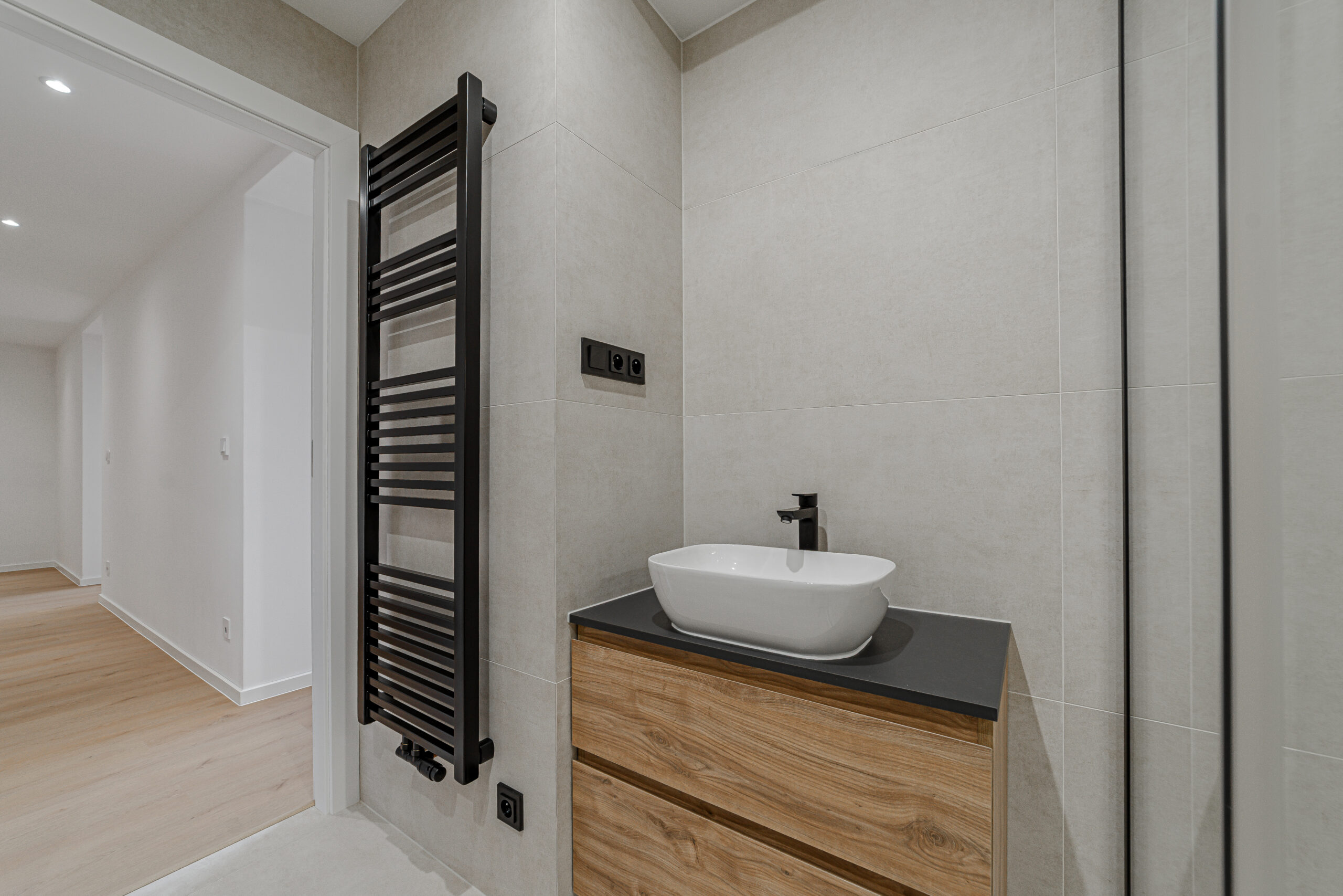 Byt prošel důkladnou a kvalitní rekonstrukcí s důrazem na detail, funkčnost a dlouhodobou hodnotu. V interiéru se pracovalo s kvalitními materiály – italské obklady, koupelna včetně sanity Villeroy & Boch, precizně řešené kamenické rohy pro čisté linie.