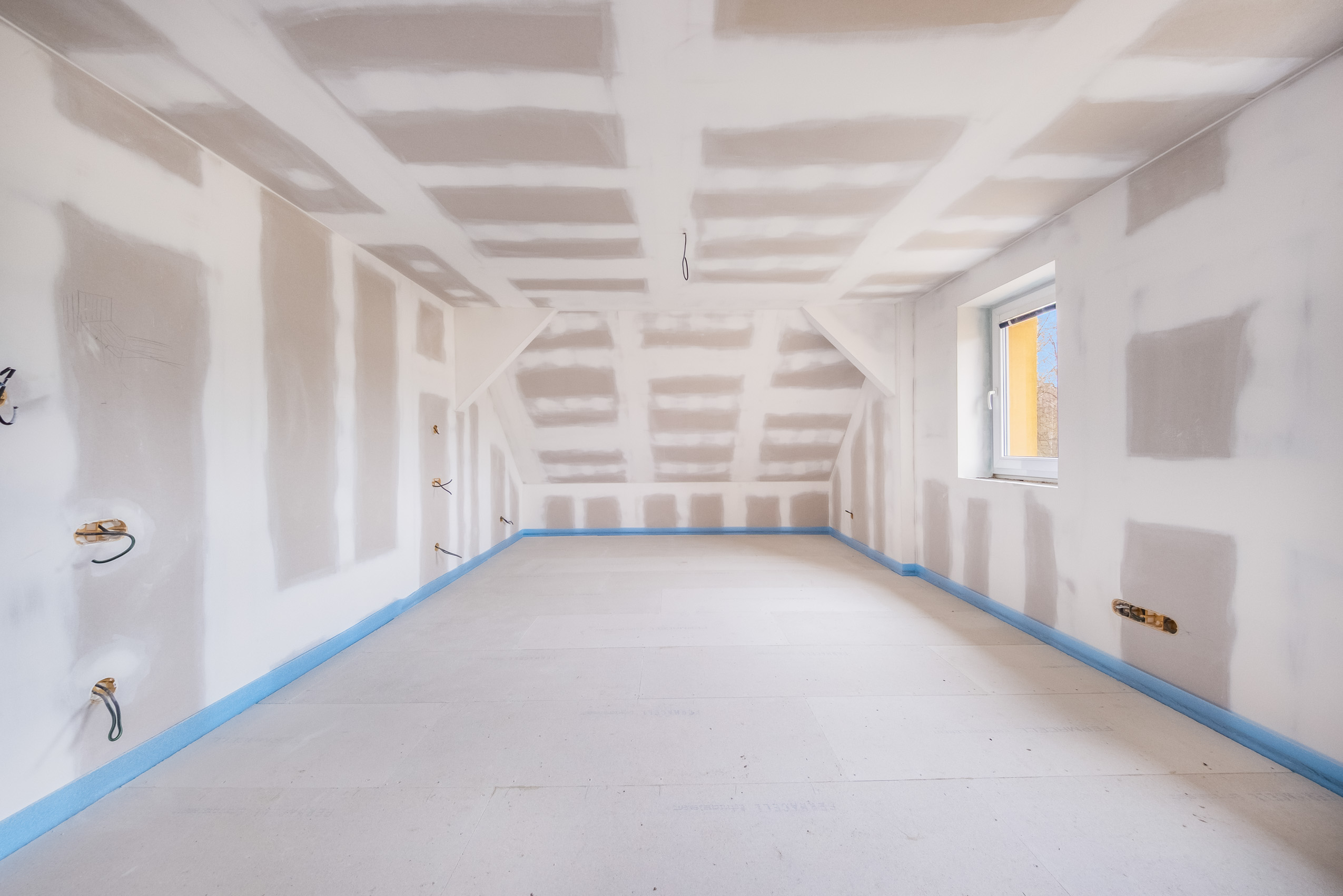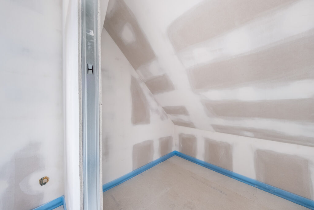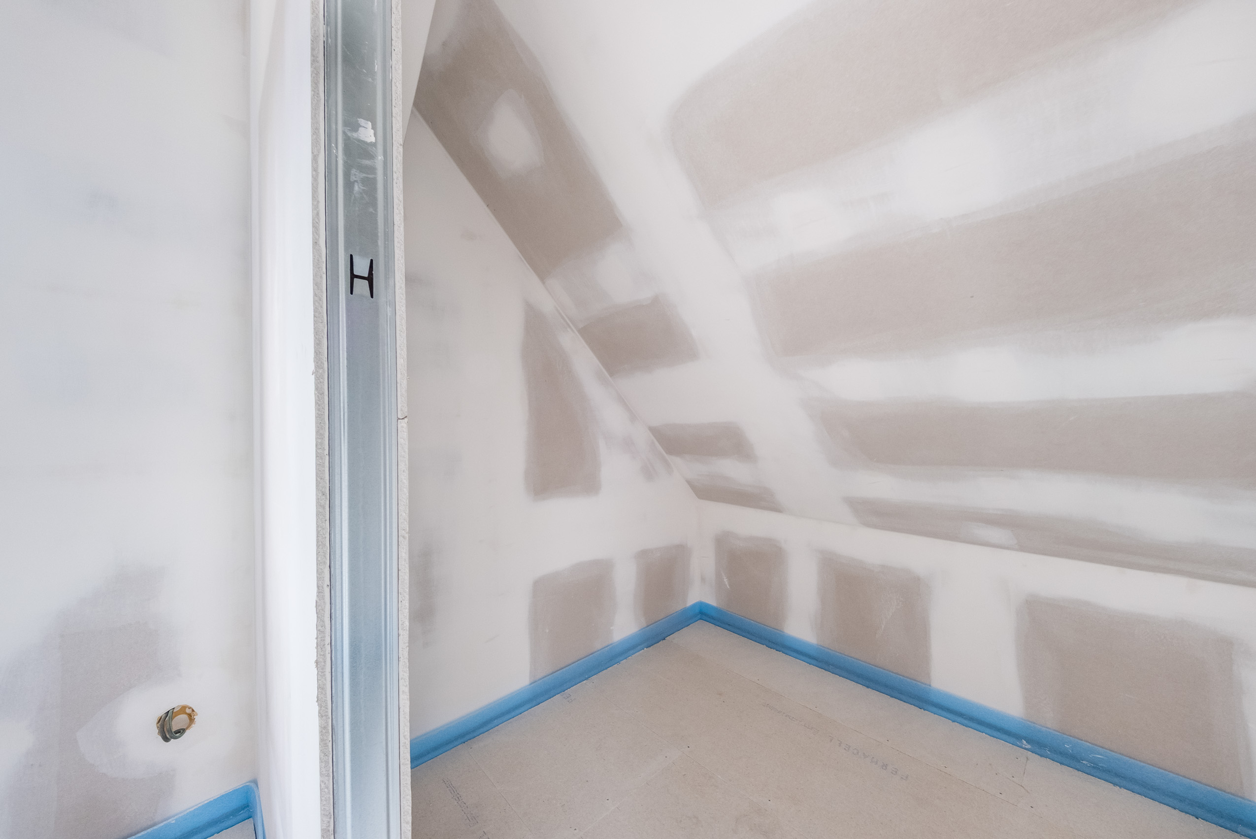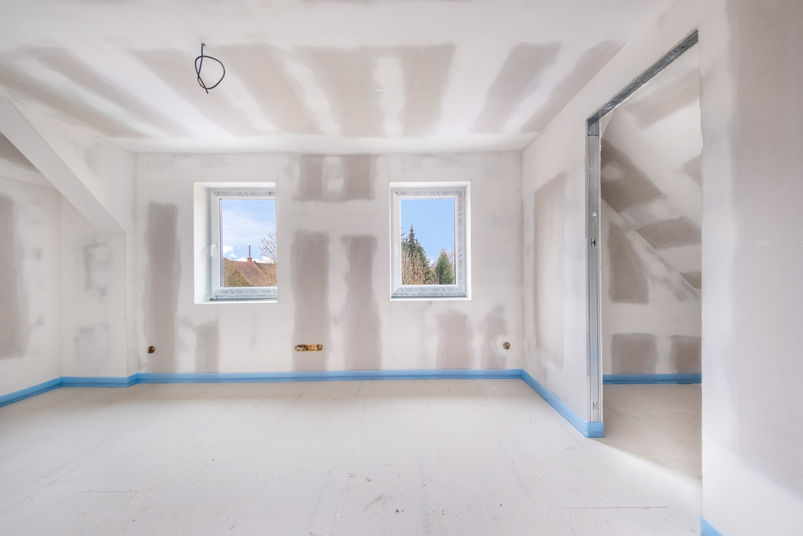 2. nadzemní podlaží (Podkroví): Aktuálně nabízí dva pokoje s potenciálem pro vytvoření ložnice a dětského pokoje. I zde je již hotová příprava na další WC.